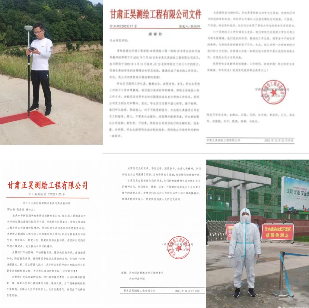 12月21日,甘肃正昊测绘工程有限公司发来感谢信,感谢BV伟德官方网站18级测绘工程专业员工在该单位的优异表现。在感谢信中,甘肃正昊测绘工程有限公司对公司在该单位实习的12名员工提出表扬,称赞他们专业理论知识与技能过硬、诚实好学、善于钻研、听从指挥、团结他人、能吃苦、不怕累。特别是在疫情防控关键期,能够挺身而出,争当志愿者,为此专门发表扬信表扬实习员工中的员工党员邵永利。